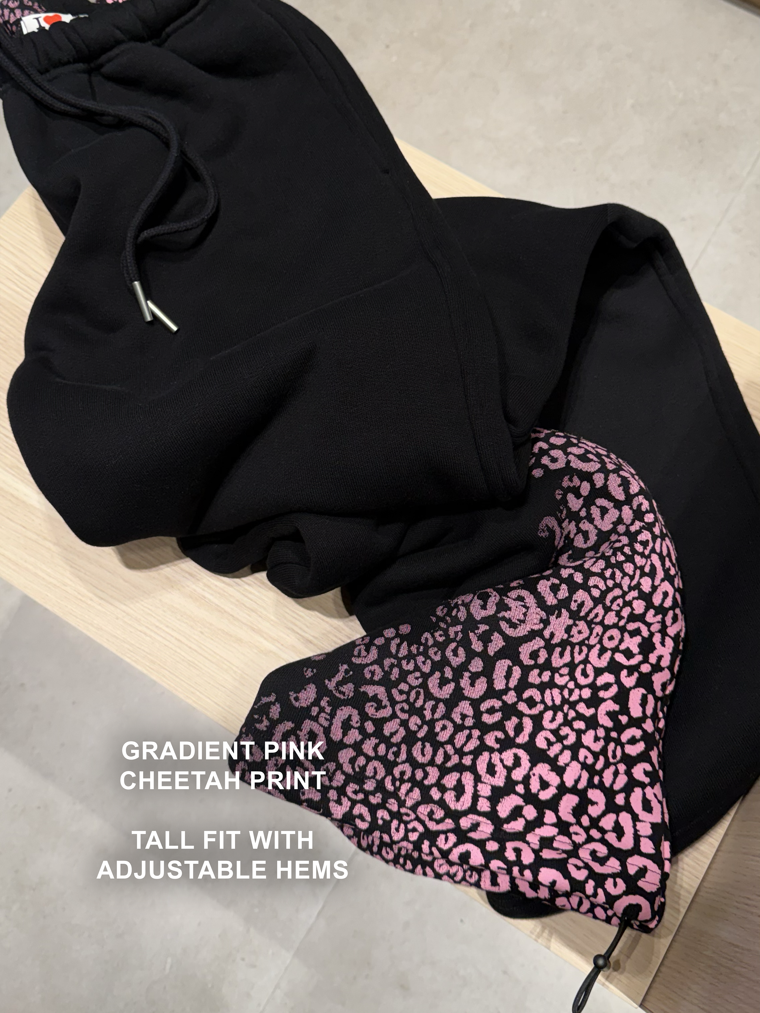 Original Design by HIDDEN CULT®. Plush lined sweatpants with a tall friendly, relaxed fit and slim elastic waistband with adjustable drawcord. Ultra soft feel with medium stretch for all day comfort. Finished with gradient pink cheetah print on the hip and lower leg, adjustable hems, and matte silver engraved badge branding.